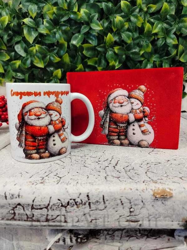 Албумът е ръчно изработен от мек кадифен на допир червен велур с празнчна щампа, готов да побере 10 снимки с размер 10/15см. Всяка страница е изработена от качествен структурен картон със самозалепващо покритие / премахвате белия лист и поставяте снимката/. Чашата е от вичкокачествена керамика с професионален сублимационен печат с красив дизайн, като от задната част са поместени пожелания за здраве, любов, късмет... и други, които я превръщат в красива керамична картичка. Нека всяка глътка от нея носи радост и наслада, като запазва спомена от тези красиви празници.