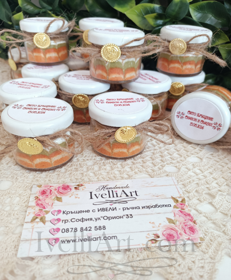 Поднесете на гостите си малко вълшебство с етно привкус с това красиво бурканче с шарена сол! Идеален подарък за кръщене, юбилей, сватба или специален повод, той е не само практичен, но и символичен – капачето е украсено с етно мотиви и персонализирано с име и дата на празника. Декорарано с канап и придружено от пендарче за берекет, за късмет и изобилие. Всяко бурканче е внимателно декорирано, за да остави топъл спомен у вашите гости.