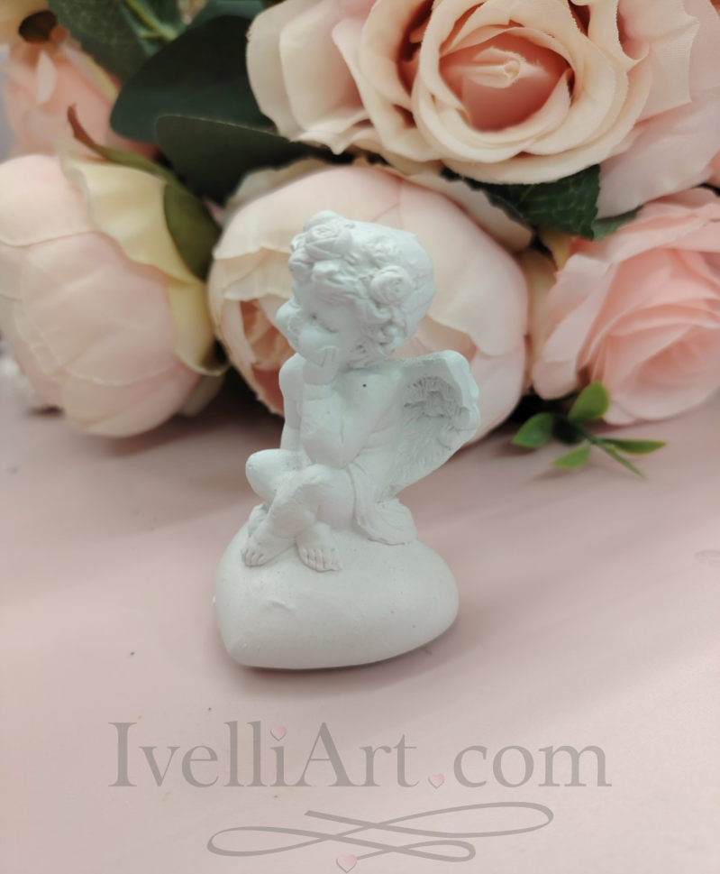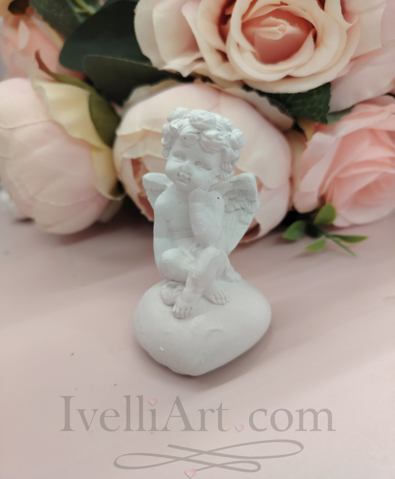Ангелчето е символичен сувенир, подходящ като подарък за кръщене, погача, прощъпулник или изписване на бебе. Тази фигурка е изработена от висококачествен керамичен гипс и представлява ангелче около 7 см височина, което е седнало в сърце.