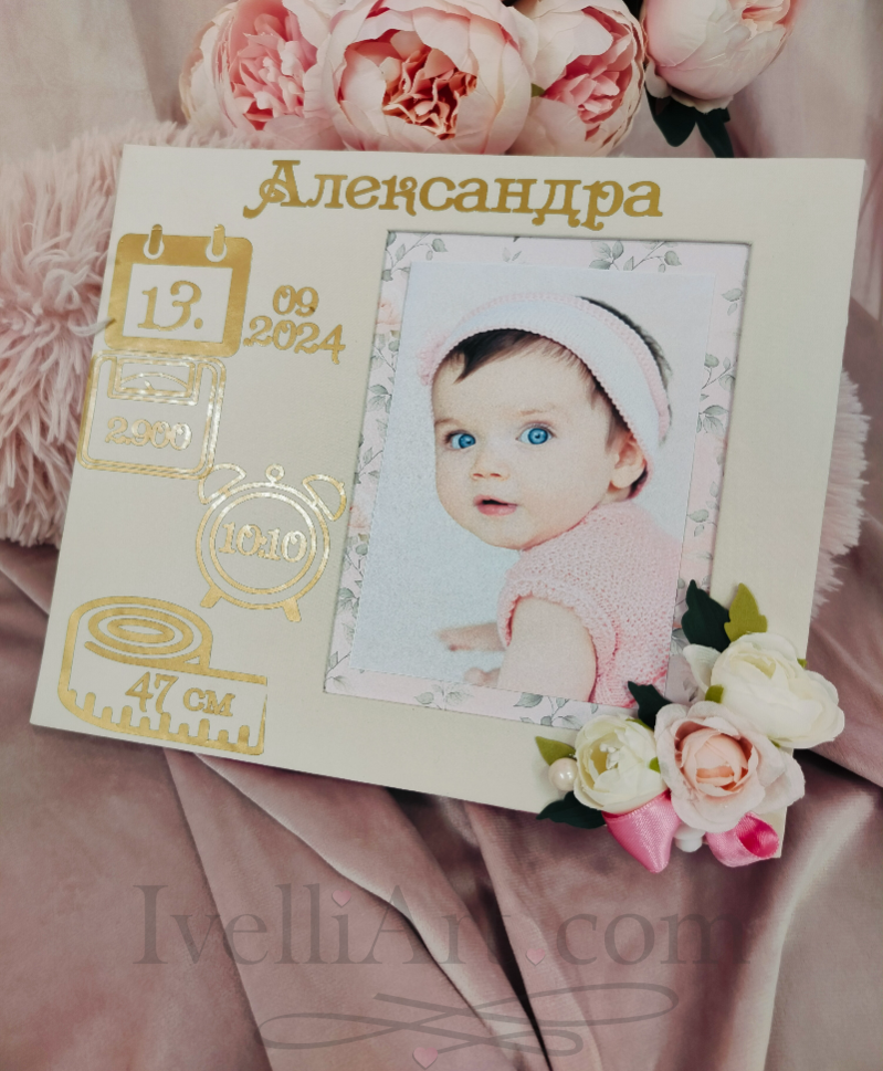 Визуалната композиция е внимателно подбрана – златни надписи за ръст, тегло, дата и час на раждането, съчетани със семпла, нежна декорация по желание, която придава елегантност, без да претрупва детайла. Рамката може да се изработи както за момиче, така и за момче, което я прави универсален подарък за кръщене, погача или изписване на бебе.